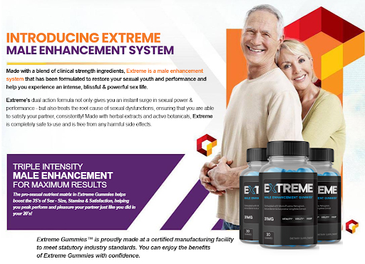 Extreme Male Enhancement Gummies are dietary supplements marketed to boost male sexual health, improve performance, and enhance vitality. These gummies typically contain a blend of natural ingredients such as L-arginine, ginseng, horny goat weed, maca root, and tribulus terrestris, all of which are known for their potential benefits in promoting better blood flow, increased libido, and improved stamina. The gummies are designed to be a convenient and tasty alternative to pills or powders. While many users report positive results, the effectiveness of these supplements can vary, and their claims are not always supported by robust scientific evidence. As with any supplement, it’s crucial to consult with a healthcare provider before use to ensure safety and avoid potential interactions with other medications or health conditions.