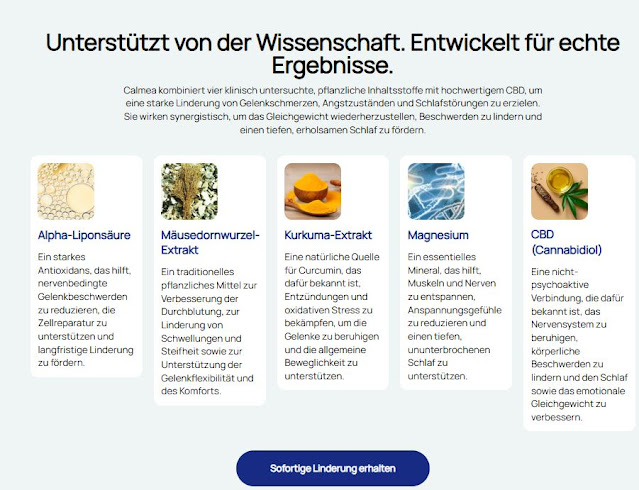 Calmea Kapseln Deutschland kann eine wichtige Ressource zur Beruhigung von Körper und Geist sein. Es interagiert möglicherweise mit den Rezeptoren des Endocannabinoid-Systems, spendet Trost und lindert Ängste. Es kann Ihnen helfen, einen ruhigen Zustand zu erreichen, ohne die Müdigkeit und Verwirrung, die oft mit anderen Medikamenten verbunden sind. Wenn Sie einen anstrengenden Arbeitstag haben oder mit aufdringlichen Gedanken zu kämpfen haben, Calmea Erfahrungen Ihnen helfen, eine ausgeglichene Stimmung zu bewahren. Es besitzt schmerzstillende Eigenschaften, die dazu beitragen können, die Schwere Ihrer Beschwerden zu lindern.