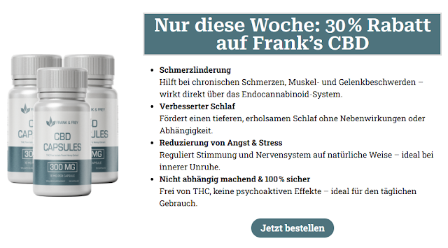 Wenn Sie Frank Frey CBD Deutschland, Österreich, Schweiz kaufen möchten, unterstützen wir Sie gerne. Klicken Sie einfach auf den Link auf dieser Seite, um zur offiziellen Website zu gelangen. Das Unternehmen bietet exklusive Angebote, die Ihnen die optimale Gelegenheit bieten, schnell von diesem Angebot zu profitieren und das Produkt zum bestmöglichen Preis zu erwerben. Zögern Sie nicht, dieses attraktive Angebot zu nutzen, das perfekt zu Ihrem Budget passt. Frank Frey CBD Kapseln Deutschland. Verpassen Sie diese großartige Gelegenheit nicht; sichern Sie sich jetzt Ihr Angebot zum reduzierten Preis.