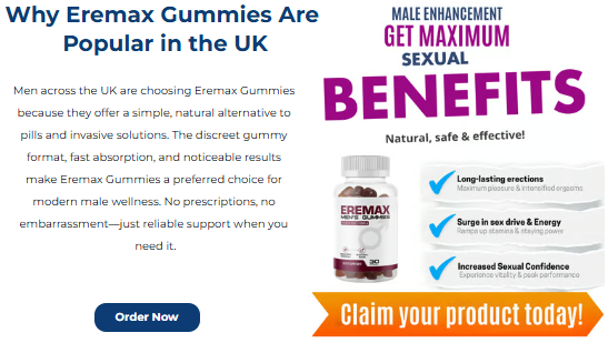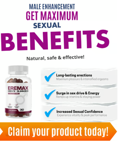 Eremax Male Enhancement Gummies is a male enhancement product that utilizes a synergistic combination of clinically effective ingredients to assist men in reclaiming their vitality, stamina, and enhancing their intimate relationships. The manufacturer asserts that it can provide an immediate uplift in capability and vigor while also addressing the fundamental causes of erectile difficulties, ensuring lasting satisfaction for partners. Eremax is promoted as a potent remedy for three crucial issues affecting performance: penis size, endurance, and fulfillment. The product consists of a nutrient-rich amalgamation believed to support these facets. According to the manufacturer, Eremax Gummies can aid men in experiencing gratifying encounters and satisfying their partners. Eremax Gummies is categorized as an enhancement product that employs clinically potent ingredients to help men improve their vitality and enjoy a dynamic and healthy intimate life. The product claims to confront the underlying causes of erectile challenges, making it reliable for both individuals involved. Eremax Gummies is marketed as a solution for augmenting penis size, stamina, and satisfaction, owing to its nutrient-rich formulation. The manufacturer guarantees that the product can assist men in satisfying their partners during intercourse.