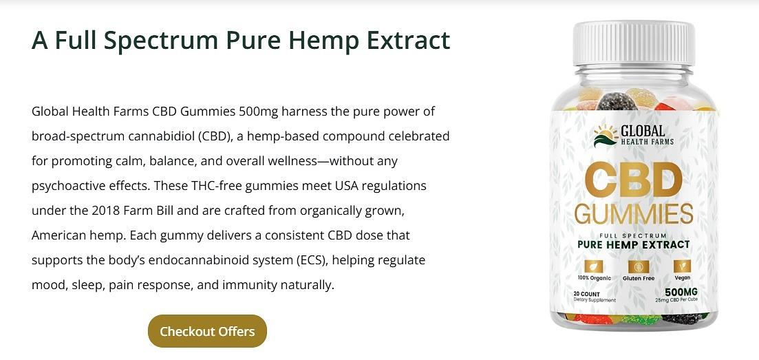 Global Health Farms CBD Gummies are consumable supplements infused with cannabidiol (CBD), a naturally occurring compound sourced from hemp plants. Unlike THC, CBD is non-intoxicating, implying it does not produce a “high” effect. These gummies are crafted to provide the therapeutic benefits of CBD in a convenient format. They typically feature fruit flavors, making them enjoyable for daily consumption. The product is frequently promoted to enhance relaxation, mental clarity, sleep quality, and overall physical well-being.