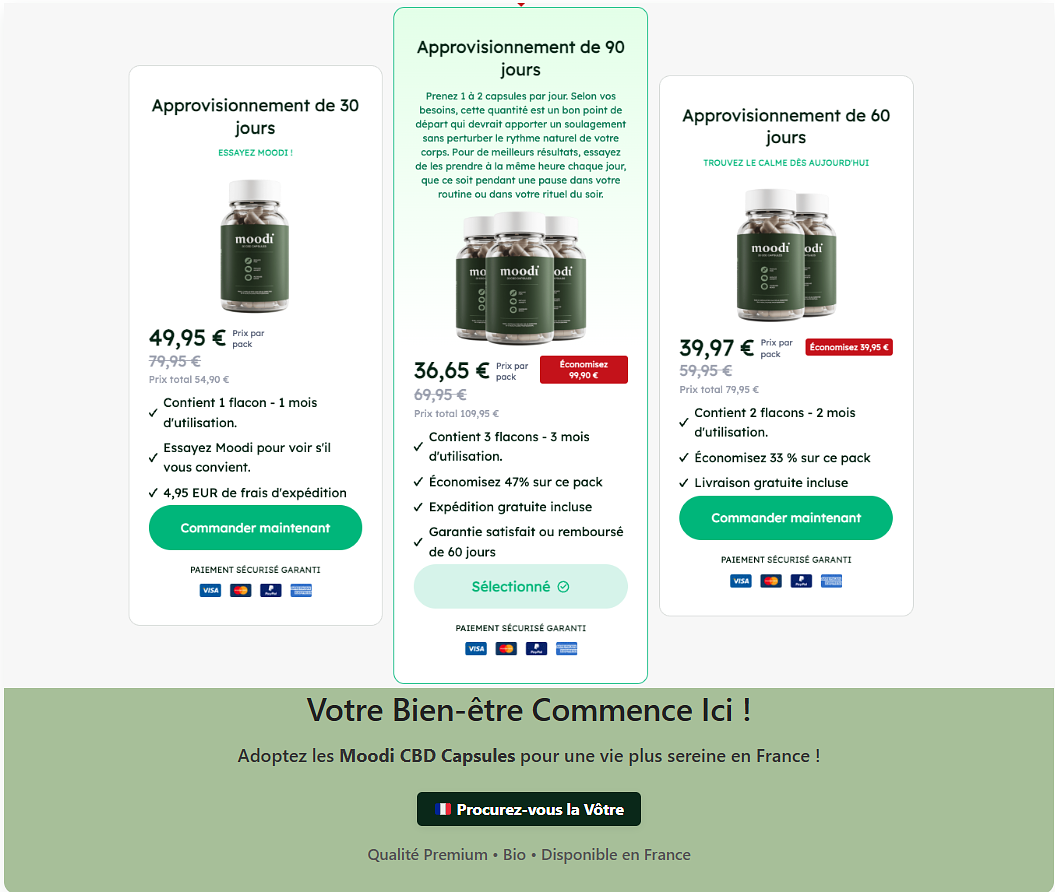 En 2025, alors que le stress, l’anxiété et les troubles du sommeil touchent de plus en plus de Français, les compléments au CBD gagnent en popularité comme alternatives naturelles. Moodi CBD Capsules se distinguent par leur formule à spectre large sans THC, promettant une relaxation douce, un meilleur sommeil et un soutien à l’humeur sans effets psychoactifs. Ces capsules, faciles à intégrer dans une routine, sont fabriquées à partir de chanvre européen bio pour une qualité optimale. Mais Moodi CBD Capsules France répond-il vraiment aux attentes, ou est-ce un simple effet de mode ? Dans cet avis détaillé de 1000 à 1200 mots, nous analysons les ingrédients, les bienfaits, les retours d'utilisateurs et les éventuels inconvénients de Moodi CBD. Basé sur des données Trustpilot (4.4/5) et le site officiel moodicbd.com, ce guide vous aide à juger si ce produit mérite une place dans votre quotidien. Découvrons ensemble !
