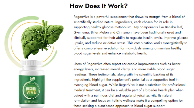 A state-of-the-art dietary supplement called Regen Vive was created to assist people in maintaining normal blood sugar levels. It creates a potent mixture that targets Regen Vive levels and supports general metabolic health by fusing cutting-edge research with traditional herbal therapies.By assisting the body's natural ability to regulate blood sugar levels, this supplement helps lessen the spikes and crashes that frequently result in exhaustion, irritation, and other problems linked to blood sugar imbalances. Compared to conventional blood sugar management techniques, the formula provides deeper and more efficient support because it is made to function at the cellular level.