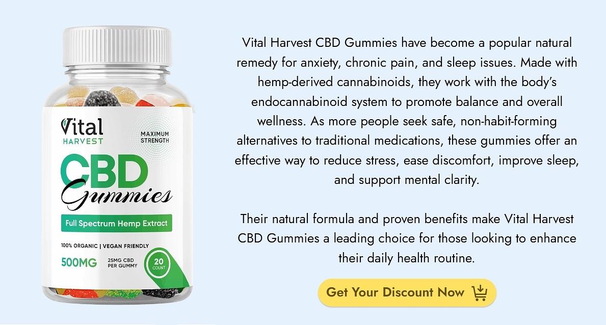 Vital Harvest have rapidly ascended in favor among wellness aficionados in search of a natural, convenient means to foster equilibrium in their daily routines. Composed of high-quality hemp-derived CBD, these gummies provide a straightforward method to facilitate relaxation, alleviate everyday stress, and enhance overall wellness. Unlike oils or capsules, they are effortlessly consumable, palatable, and seamlessly integrate into any regimen, rendering them ideal for both novices and seasoned CBD users alike. Each gummy furnishes a uniform dosage of CBD, enabling users to benefit from its calming effects without the inconvenience of measuring or preparation. As an increasing number of individuals gravitate towards botanical solutions for improved mood, comfort, and sleep quality, Vital Harvest CBD Gummies emerge as a readily available alternative.