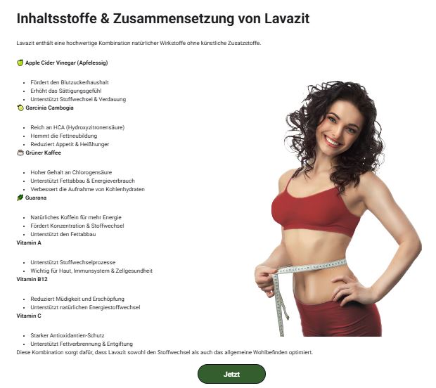 Lavazit ist ein Nahrungsergänzungsmittel zur Unterstützung der Gewichtskontrolle, indem es den Stoffwechsel ankurbelt, den Appetit zügelt und das Energieniveau steigert. Als natürliches und wissenschaftlich validiertes Produkt vermarktet, hat Lavazit bei Menschen, die eine einfache und effektive Unterstützung beim Abnehmen suchen, an Beliebtheit gewonnen. Das Produkt ist in Kapselform erhältlich und lässt sich mühelos in den Alltag integrieren. Sein Reiz liegt in dem Versprechen, spürbare Ergebnisse zu liefern, ohne dass dafür große Änderungen des Lebensstils erforderlich sind. Diese Inhaltsstoffe können natürliche Substanzen wie Lavazit Fruchtgummibärchen Koffein und andere pflanzliche Bestandteile enthalten, die für ihr Potenzial zur Steigerung des Energieniveaus und zur Förderung einer schlankeren Figur bekannt sind. Lavazit Erfahrungen Produkte positionieren sich als praktische Ergänzung zu einem gesunden Lebensstil, neben einer ausgewogenen Ernährung und regelmäßiger Bewegung.